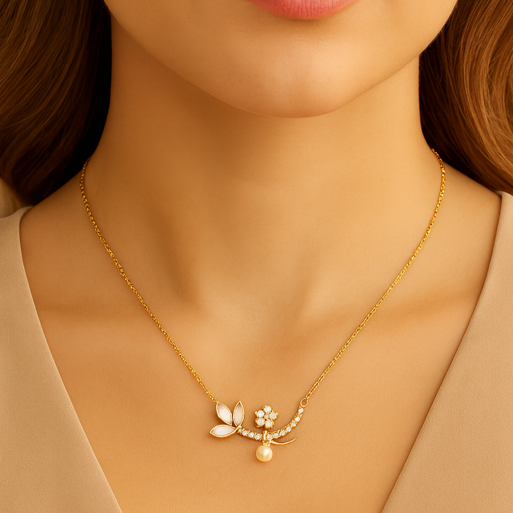 The Blush Grace Necklace brings a gentle flourish of femininity and charm. Crafted in 925 sterling silver with a romantic rose gold finish, the pendant features blush-pink marquise stones, a sparkling cubic zirconia flower, and a dainty pearl resting on a graceful vine. Every detail speaks of softness, balance, and elegance.