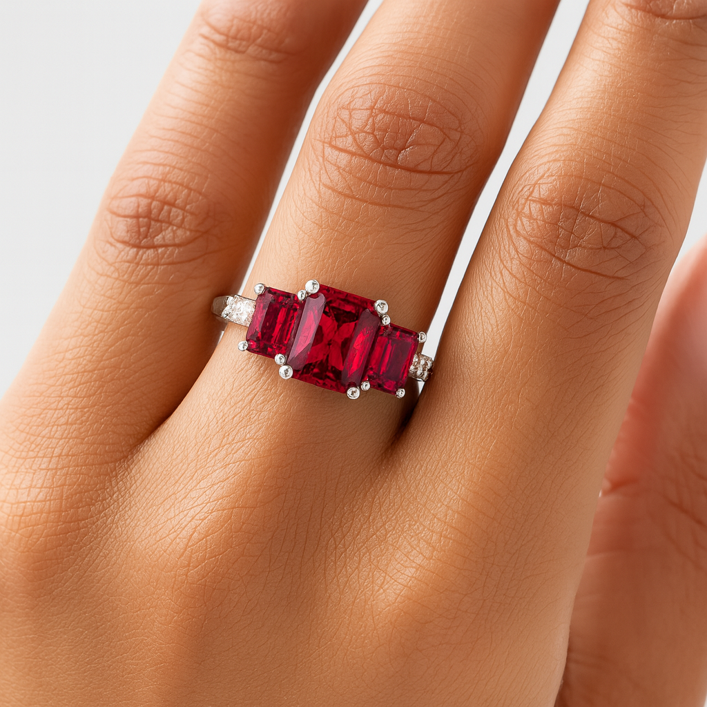 Stones: High-quality red gemstones (radiant cut) with cubic zirconia accents on the shoulders